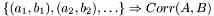 This function assigns a real number (the correlation value) to two sets of real numbers. $\{(a_1,b_1),(a_2,b_2),\ldots\}\Rightarrow Corr(A,B)$. $corr(A,B)=\frac{Cov(A,B)}{\sqrt{Cov(A,A)*Cov(B,B)}}$ where $Cov(A,B)=E((A-E(A))*(B-E(B)))$